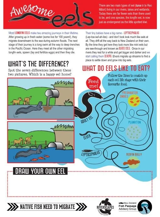 The DOC website has lots of interesting information about longfin eels and some links to more articles about them. The great activities for kids listed below, are straight from their site, please click HERE to see the full website and original source. We think they are fantastic ideas!