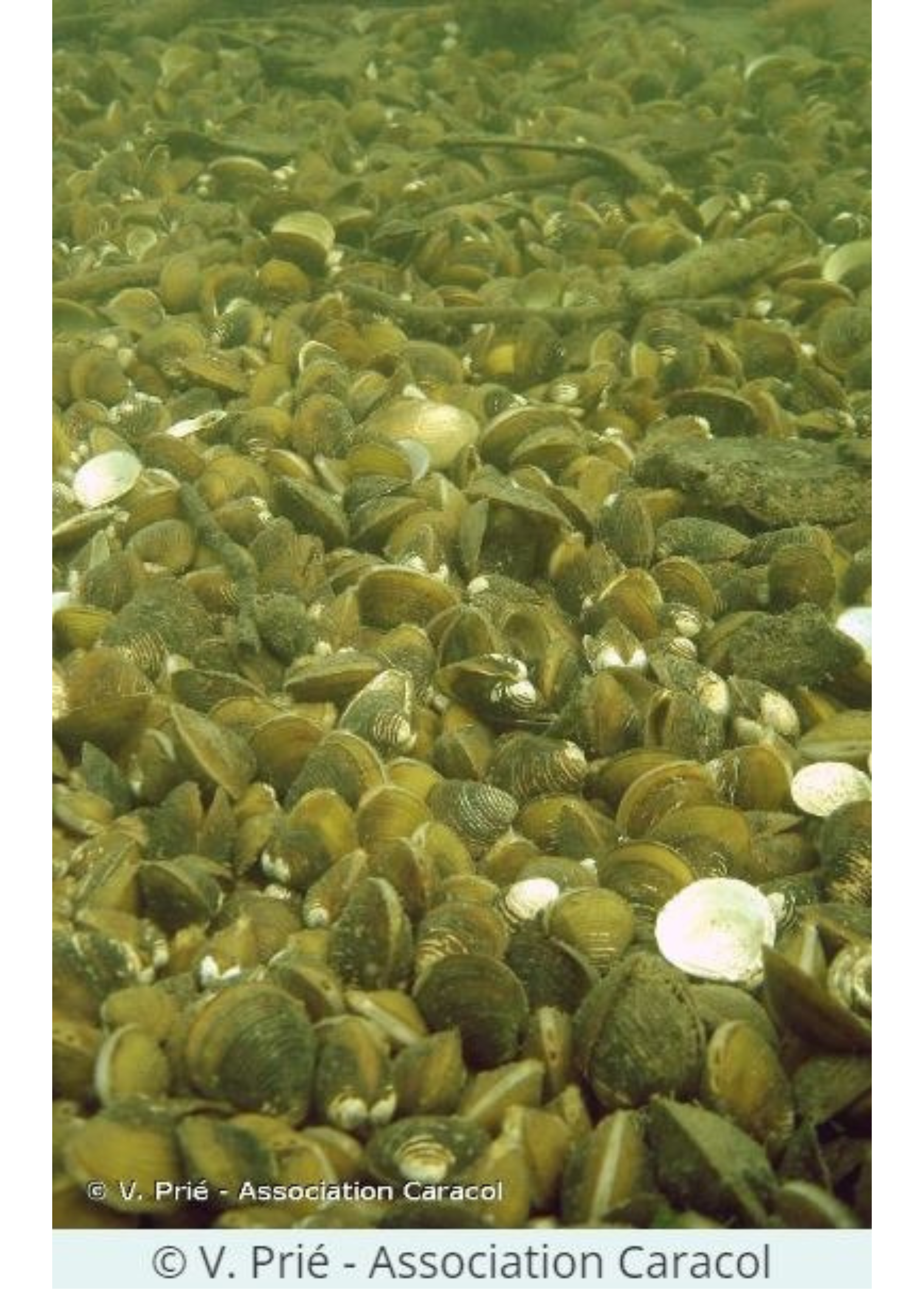 This photo by Vincent Prie was taken in a lake in France where these clams have accidentally been introduced. It shows the impact that they can have on an environment.