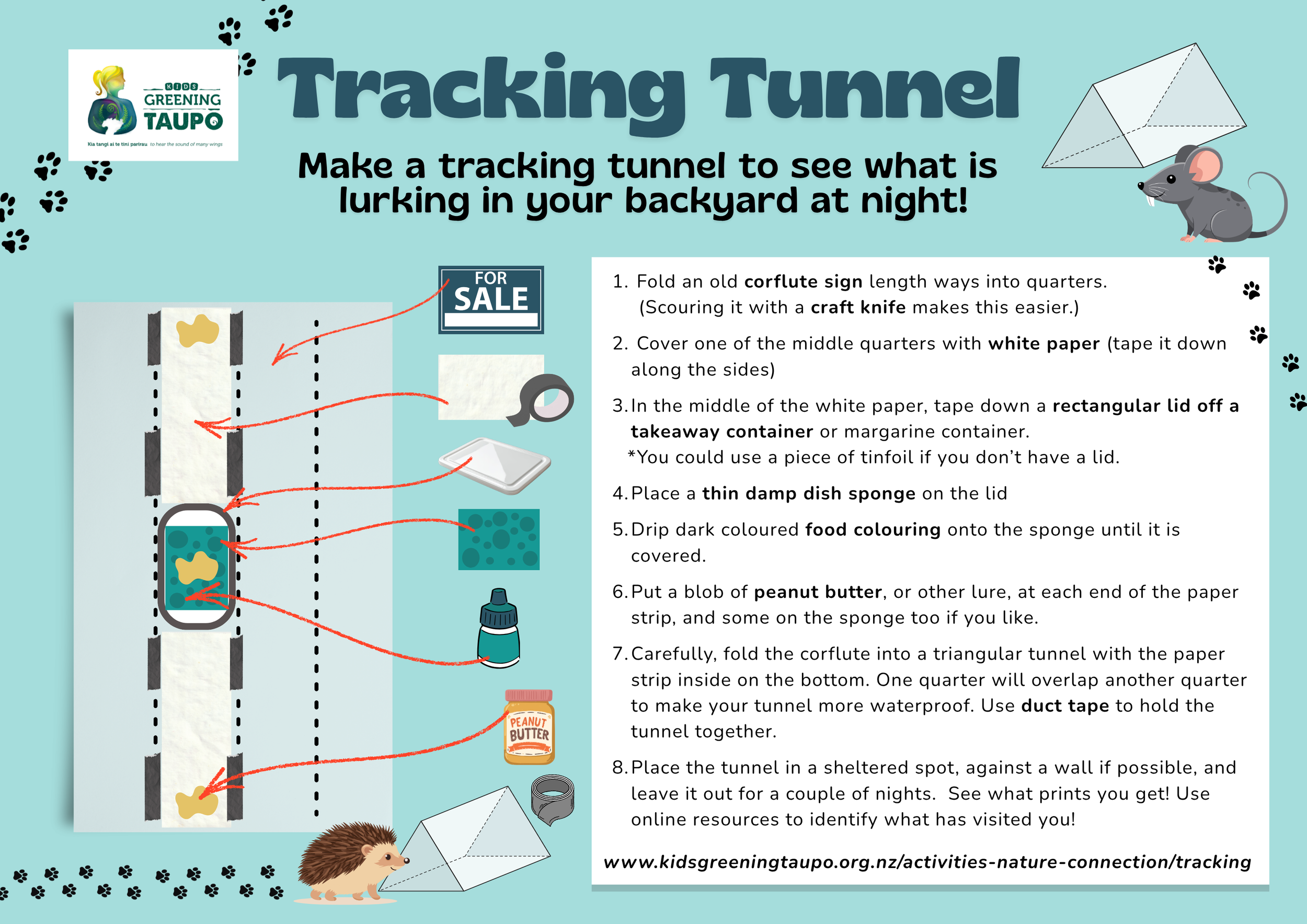 We like to use an old corflute sign and fold it into a tunnel, line the bottom with white paper, add a plastic lid in the middle with a kitchen sponge soaked in food colouring, pop in some peanut butter as a lure and then put it outside. Make sure to think like a nocturnal critter when you place it! Put it up against a building , or under a bush, as critters, such as rats, don’t like running in open spaces. Make sure that one end isn’t blocked, as animals are more likely to enter it if they can see right through it and see a safe exit. Finally, place it somewhere sheltered if it is likely to rain. Rain will wash away the footprints. Good luck!